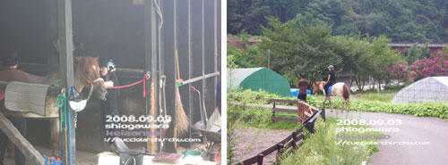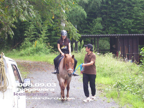 たっぷり、、、(でもないけど^_^; )癒された渓山荘を後に家路へ。 その前に。 な、なんと、 お馬さんに乗ってしまった。 お宿をチェックアウトする際、責任者の女性から 「新しい牧場を作っていて、ホースセラピー(ヒポセラピー) などをメインで運営していくのですが、 初めて馬に乗られる方でアンケートに答えていただければ 無料で体験していただきたいのですが。」 との申し出!! もちろんアンケートいくらでも書きますとも!!(笑 馬は見てるのは大好き♪ 以前北海道で引き馬で乗ろうとしたのだけど、間近で見ると やっぱデカくてちょっと怖い。 しかし、、、やっぱりお馬さんは好き。 「よっしゃ~、やってみよっか。」と。 乗る前にお馬さんのタテガミからカラダ全身ブラッシング。 そうすることで気持ちが通じ合うんだって♪ もちろんお馬さんが「気持ちええなぁ。」と感じるブラッシングの仕方を 教わった上で。 それから、乗り方の練習に、万が一急に馬から降りなければならなくなった 時の降り方の練習。 パニックになって降りることがいちばん危険なのでこれはかなり重要らしい。 場内を出て、引き馬でゆっくり宿敷地内から川沿いの道をお散歩。 馬の常歩の動きを利用し神経学的疾患の治療などの効果をあげるらしい。 また腰痛などにも効き目があるとか。 最初はぎこちなかった乗り方も、30~40分乗った終わり頃になってようやく 馬の動きと連動した乗り方が出来てきたようで乗り心地も快適 ![]() 途中ちょっとした上りで土がぬかっていて、馬が滑りそうになり かなり焦ったけど。 終了後ハーブティーをいただき、ヨーロッパの田舎風なテラスをあとに。 人間の(ワタシだけだけど、、、笑)お楽しみの後は近くの河原で しばしのお散歩タイム。 連日お天気にも恵まれ、とっても素敵な思い出になる旅行でしたぁ ![]() HPのTRAVEL[ミース & ペッキアも一緒旅行]にアルバム作って載せました。 ひとつのページに何枚かをアレンジして作ったので 数はさほどありませんけど~。 これで2カ月も前の旅行記事完成ですぅ ![]() 2008/11/12(Wed) 00:16:51