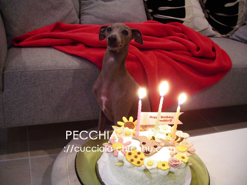 ペッキアたん、今年は無事にケーキが食べられます(笑 去年は急な体調不良により自分のケーキが食べられない有様。 そのケーキはミースとワタシでおいしいただかせてもらいましたの~(^_^;) まっ、もちろん今年もご相伴にあずかりますが、、、。 PECCHIA=みつばち ![]() 、、、なので、みつばちちゃんをトッピングしてありま~す。 ペッキアらしく賑やかな飾り付け。 かなり、いいアイデアじゃん! 本人はもちろんまったく分かっていません。 飼い主の自己満足です。 豪快に食べさせてあげようとしたのだけど、 小さく切り分けてあげた方が良かった? 「ママちゃん、あたちたちレディなんでちゅから!」(MP PR 2008/10/02(Thu) 18:46:14