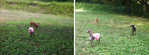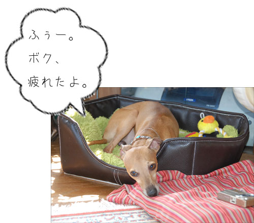 「御無沙汰~!」な鎌倉で、久し振りに遊んできました。 最後に行ったのは4月。 大変混雑している紫陽花の時期もやり過ごしているうち、 今度は空梅雨のまま、夏本番。 日中は暑すぎて遊べない日が続いたのだけど、 この日は少々雲も多く、日中遊ばせるには絶好の日。 ある理由から、赤ちゃん帰りしたアロちんと たまごちゃんの取りっこで楽しく駆け回る (、、、っつうか、爆走だけど、、、。) アロちんとペッキア。 ペッキアは久々イタグレとの駆けっこで大満足♪ ミースはアロ&ペッキアを遠目に、一面の サラダバーで食べまくり~ ![]() 挙句の果てに「ゲーゲー。」 ![]() 「ボク、、、。」 「おうちで体力使うから、ペッキアと駆けっこで鍛えなきゃ 」「その前に、ちょっとひと休み。」 「アロちんがペッキアと遊んでくれるから、あたち、助かるの。」 フリフリワンピでおめかししてみたものの、遊んでる姿はとても 可憐とは言いがたく ![]() 「へーへー、あたちいっぱい走れて楽ちいな 」さて、たくさん遊んだ事だし、恒例のカフェめしへ~ ![]() to be continues. ![]() 2008/08/24(Sun) 17:35:47