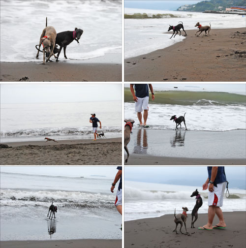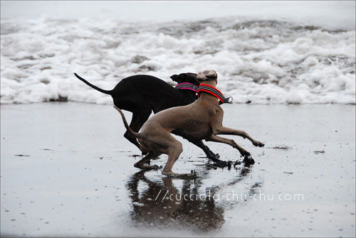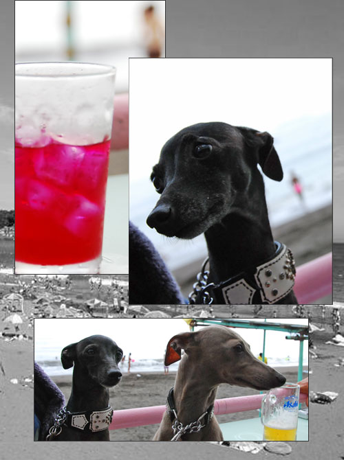 ちょっと雲が多く涼しかった日。 ちび達を連れてお友達の海の家に行って来ました。 海水浴客の監視をしている、ライフガードの兄ちゃん達が引ける17:00。 これからサーフィンタイム。 砂浜も焼け焦げていないので、こちらも遊ばせて頂きましょ♪ ミース、ここが大好きなようで、ここへ来るとよく遊ぶ。 海もへっちゃら。 以外と臆病なのがペッキア。 川は大丈夫なのだけど、どうやら海は苦手な御様子。 リードにつないで泳がせようと、いくら引っ張っても入ってこない!! 波が近づくと怖くてすぐ逃げる。。 海の家特製、「赤紫蘇じゅーす」うまかったなぁ~♪ ビタミンも豊富だし、紫外線からのシミ予防に少しは役立つかしら(-。-)y-゜゜゜ 海の家に来ていたお客さんファミリーが連れていた、ミースと同じブラックの1歳男子、「オレオ」君。 ナント!お住まいもすぐ隣りの市だった。 少々ミースよりは大きくなっていたけど、とってもお顔の整ったステキなメンズでした(爆 今度どこかで会えるかな。 ミースが海に入っていている写真ばかり。 もっとたくさん遊ばせてあげたいけど、ミースは波打ち際に出来た泡泡を 生き物と思っているのか、戯れて、、、と言うより噛み付いて?海水ごと 飲んじゃう。。 なのでほーって置くと飲みすぎてゲーしちゃうし、巻いている砂も 混じっているのでほどほどのところでやめさせないと。 海でもドッグランでもボール遊びさえ出来れば大喜びのペッキアも よだれが付いたボールに砂も付く。 払ってあげてもこれまたお口に砂が入る。 なので海で遊ぶのもほどほどにしとかないとねっ(^^)b PR 2008/08/13(Wed) 17:24:14
