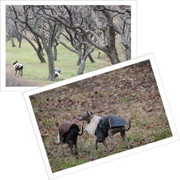 根岸森林公園の梅も寒さの中、咲き始めています♪ まだまだ蕾が多いけれど、もうじき一斉に咲きほころぶのだろう。 この公園は思い出深い公園。 ミースを飼い始めて6ヶ月くらい経った頃、 まだどこへ行ってもイタグレとは遭遇しない珍犬!だった頃(笑 イタグレの集まりに誘われて、オットが野球で来れない為 ひとりで運転してやって来た。 その時はまだまだやんちゃ盛りのミースは 初めてのお友達とも臆することなく かけっこして楽しんでいたっけ。 存分に遊んだ後、元町のドッグカフェにも初めて行った。 ミースはまだ外でおしっこもうんPも出来なくって あんまり長く我慢させるのも心配でみんなより先に帰ったり、 なんて事も。 まだあの頃は素直だったなぁ~(-"-)と懐かしい思い出に 顔をほころばせながらてくてくお散歩。 リスのお食事が樹の幹の間に置いてある♪ 人間が置いてあげたの? それとも自分で運んだの? 梅の樹はたくさんあるけれど、蕾が多いのでまだいい香りはしてこない。 今日は定期健診のため横浜の病院へ。 そこで呼ばれるのを待っている時、話しかけてきた おばさんが「その子と同じ種類の犬が迷子だって書いてあるわよ。」と。 掲示板を見てみると その子は「シールの♂、2歳のネロ君。 根岸森林公園で18日の夜、お散歩中にどこかへ行ってしまった。」 と書いてあった。 カプセル式の迷子札を着けていたようなのだが、、、。 と言う経緯もあり、みなとみらい近辺での用事もあったので 久々の根岸森林公園に寄ってみた訳なのだ。 お散歩していると紀州犬らしきワンを連れた飼い主さんと御挨拶。 「何犬ですか?」と聞かれたので「イタリアングレイハウンドです(^^)」と 答えると、「一昨日の晩にお友達が飼っている同じ犬種の子が ここの公園で居なくなっちゃったんですよー。」と。 他犬種のお友達もいるってことは、よくこの公園に通っていたんだなぁ、と推測。 しばらくお散歩していると、どこからともなく大声で誰かが叫んでいる。 「jujuさーーーーん。」と!! ワタシは耳を疑うと同時に、この辺にjujuさんて、、、えっ、ワタシ??? と声のする方を振り返ると誰かが手を振っている。 眼の悪いワタシだが、誰かが手を振っている事は確認できたので とりあえず振りながら近づいてみると、Cove家の面々がお揃いで。 ネロ君捜索に来たとのこと。 ちょこっと話して、「居なくなった。」と言う方角へ向って行った。 こんな広い公園で会うなんてすっごい偶然! 更に駐車場に戻ると、車まで隣りの隣りだったりして(^▽^;) 「JRTジズーのマルセイユ☆ルーレット」さん 「ほのぼのクレパルライフ」さんの BLOGに捜索の記事が載っています。 あえてリンクを控えましたが、検索すれば見つかるので よかったら覗いてみてあげて下さい。 この寒空の中、彷徨っているのかも知れないネロ君が 1秒でも早く飼い主さんの元に帰れますように。 どなたか保護してくれているといいのですが。 PR 2008/01/20(Sun) 22:26:08