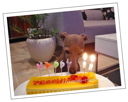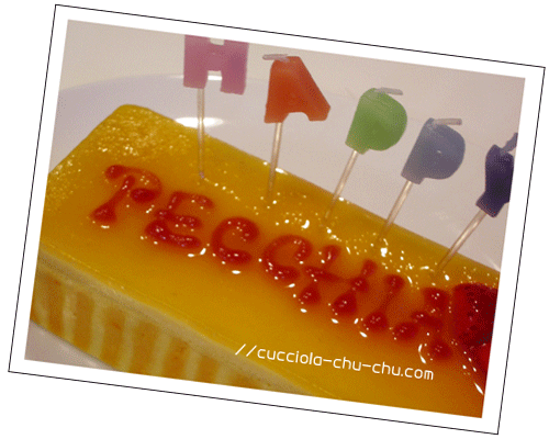 ジャンジャジャーーーン 本日我が家の末娘、ペッキアちゃんのバースデー♪ 自分で作ると豪語していたが、やっぱり頼んでしまった バースデーケーキ(^^; こちら、La Dolce Vitaはミースが2歳のお誕生日に注文したお店。 こちらはフレーバーを変えてもらったオーダーケーキ。 マンゴー&苺で出来てる。 元気っ子ペッキアにお似合いの色。 「何だかいい匂いがちまちゅ。」(P 何が何だか訳も分からず、ただただ(¬_¬。) ジーーーッと。 この後フード少々、ケーキも切り分けてあげたのだけど、、、。 食い付きがかなり悪し。 その訳、朝からあまり調子が良くなくて、ちょっとP気味&ゲー気味。 本来なら、「一食抜き」したいところだけど、何と言っても 誕生日の主役。そりゃかわいそう、、、かも、 と言う事でちーーーっとあげてみた。 たいした量でもないのにもったらもったら食べたり食べなかったり、 ちょろりと席をはずしてみたり、なんて事を繰り返していたら あっさりミースに全部食べられてしまった( ̄○ ̄;) 普段はうるさ過ぎるくらい元気なのに、こう言う時に限って 調子悪くなるなんて、なんて運の悪い子なのでしょう(>_<) 自分の誕生日祝いのケーキも食べられないなんて、、、残念。 PR 2007/09/29(Sat) 22:47:48