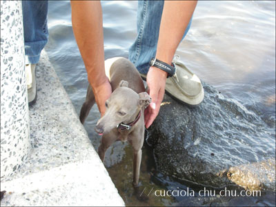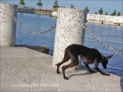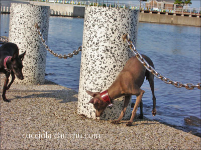 ベイサイドマリーナでランチしました。 天気も良くお空も真っ青。 「Bayside Deli」でがっつり、チーズバーガー。 水浴び好きのMPは、海の水にも臆せず入っていってしまう有様!! オットが慌てて連れ戻す(-"-) 淵には石が積んであるけれど、その先は深いのよ!!(`o´) ミースは入ろうと試みたところで、何かを発見? 手を使ったり、唸ったり、「それ」に集中している模様。 その正体は!! 「カニ」でした。 石の間にいっぱいのかにさんが休憩中。 ミースはこう言う手のものにとっても興味をそそられるらしく、 ずっと追い掛けている。 先日も川沿いを散歩中、1m近くありそうな「ヘビ」に出くわし 一生懸命ちょっかい掛けようとしているミースから、 必死に逃げようとしてたヘビに釘付けになっていたっけ( ̄ロ ̄lll) ペッキアは気になるんだけど直ぐ飽きちゃうの。 2007/06/16(Sat) 23:48:21