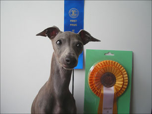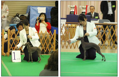 9月17日(日)に「東京南イタリアングレーハウンドクラブ」主催、 日本初のIG単犬種展が開催されたのです。 ペッキアの生家である よしりん家のフィーネ(母)、メラッサ(妹) と共に初出陳させていただきました。 実は、IG単犬種展のお話を聞いたアジアインターの時には ワタシは参加賞(手作りイタグレステンドグラス)目的のつもり。 しかし、出るからには恥はかきたくない。 なので自分的にはしっかり練習して臨みました。 もちろん、ペッキアも大変頑張ってくれましたが、 未熟なワタシはなかなか良さを引き出せてないかも。。 お姉ちゃんのミースも当初出陳予定でしたが、彼女の性格からして ショーに出すにはかなりのストレスを与えることが予測されるので 彼女は断念いたしました。 クラス1席、エクセレントのロゼットを いただきました!! 誇らしげ?なペッキア。 ワタシも本当に嬉しいです(≧▽≦) 今までの人生で1.2を競うくらいの 緊張でしたが、振り返ると楽しかったなと(^^; 応援してくださったみなさま、 暖かい言葉をかけてくださったみなさま、 本当にどーもありがとうございました。 帰り際、いいお話を聞かせてくださった 主催者さまのショーに対する思いを 重く受け止め励みにしようと思います。 心優しい、たくさんのお友達がお写真を撮っていたようなので 後日そのすばらしい腕前のお写真をいただけましたら 改めてアップしようと思います(爆 PR 2006/09/18(Mon) 14:03:38