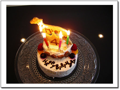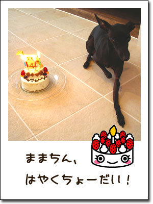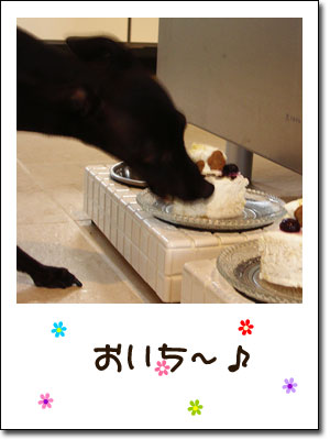 ありがとうございますぅ~(*^-^*) ペッキアを怒ったりとか、大人気ない部分もたっくさんあるんですけど、 だいぶ社交的に振舞えるようになったので嬉しいです♪ ケーキも手作りしたかったのですけど、ワンコケーキショップで買っちゃいましたぁ(^^; >ローソクの火にちょっとパニクってる?? 分かります?(((~_~;) やっとの思いで撮った「ケーキと一緒写真」唯一の一枚です!! |