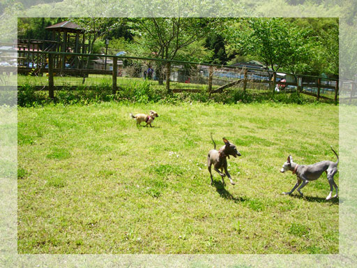 GW中の土曜日、はな家とやどりきへ。まぁ、とっても良いお天気で、おちびズはふかふかになって来た芝生の上を楽しそーに大爆走♪他の小型犬わんズも居たけれど、やっぱり走るならイタグレ同士じゃなきゃつまらないらしい。たまーに参加するダックスなんぞを「あんたもっとちゃんと走んなきゃ、つまんないわよーーー!」とばかりに追いつくと突き飛ばしたり( ̄ロ ̄lll)...なんて、そんないじわるのつもりでやっている訳じゃないとは思うけど(;^_^ゞ